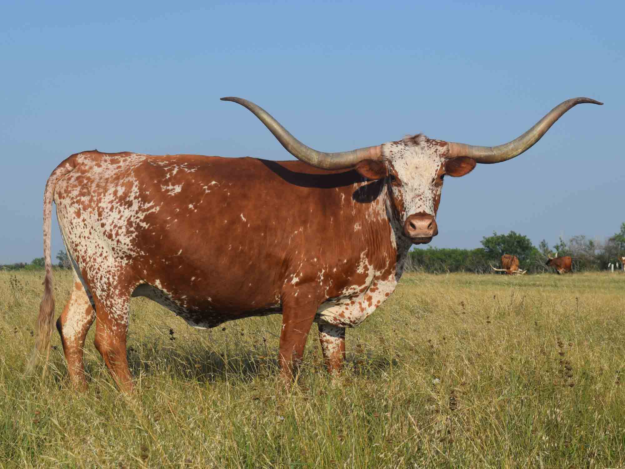 Description of ECR Lady Julia: Lady Julia was our favorite heifer when touring the great El Coyote herd, and we are very excited they gave us the opportunity to buy her. She is a striking female with great conformation and the start to a pretty horn shape. Her dam is one of the prettiest twisty horn cows we have seen, sporting nearly 80" tip to tip with great color and a full body. Her sire Julio Vixen has produced some of the best cows in the breed. The maternal line of this cow goes back to the great producer Lady Lite, the maternal granddam of breed legends Bandera Chex and Lady Monika BL. We sold Lady Julia to the great Diamond B herd a couple years ago but are very excited to have the opportunity to buy her back bred to their great Cut N Dried bull!