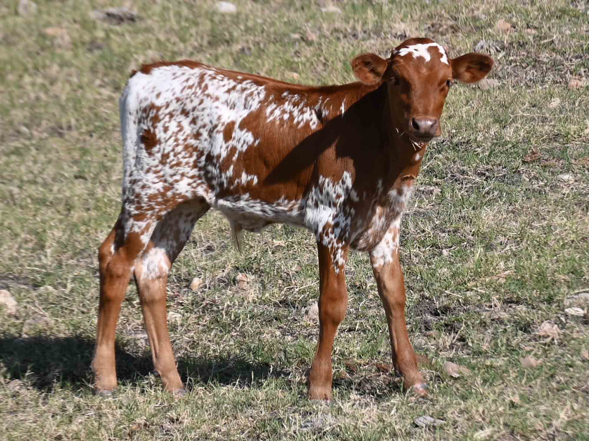Description of Pretty Dollie: Pretty Dollie is a gorgeous heifer. Her deep red color and speckles are hard to beat. She has great conformation, and she has a very good start to her horns. She is a granddaughter of our new herd sire CV Casanova's Magnum, the second bull in the breed to reach 90" tip to tip. Her maternal line goes straight back to the legendary Tari Graves FM 49. The looks and pedigree of this heifer are hard to beat!