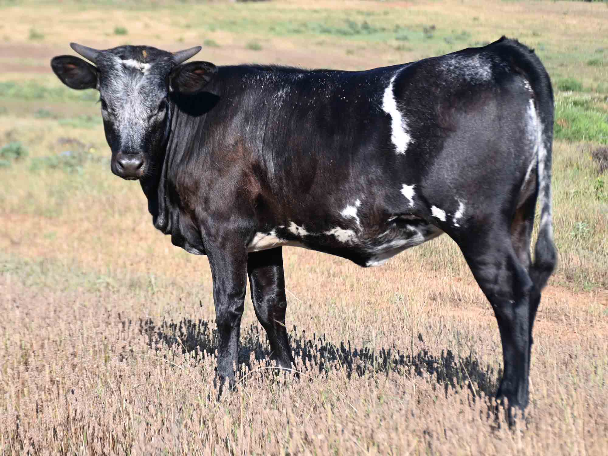 Description of RO Stockman's Delight: What a gorgeous heifer! She is a rare black with white roan. Her dam has been a terrific producer for us, and Stockman is a terrific horn producer.