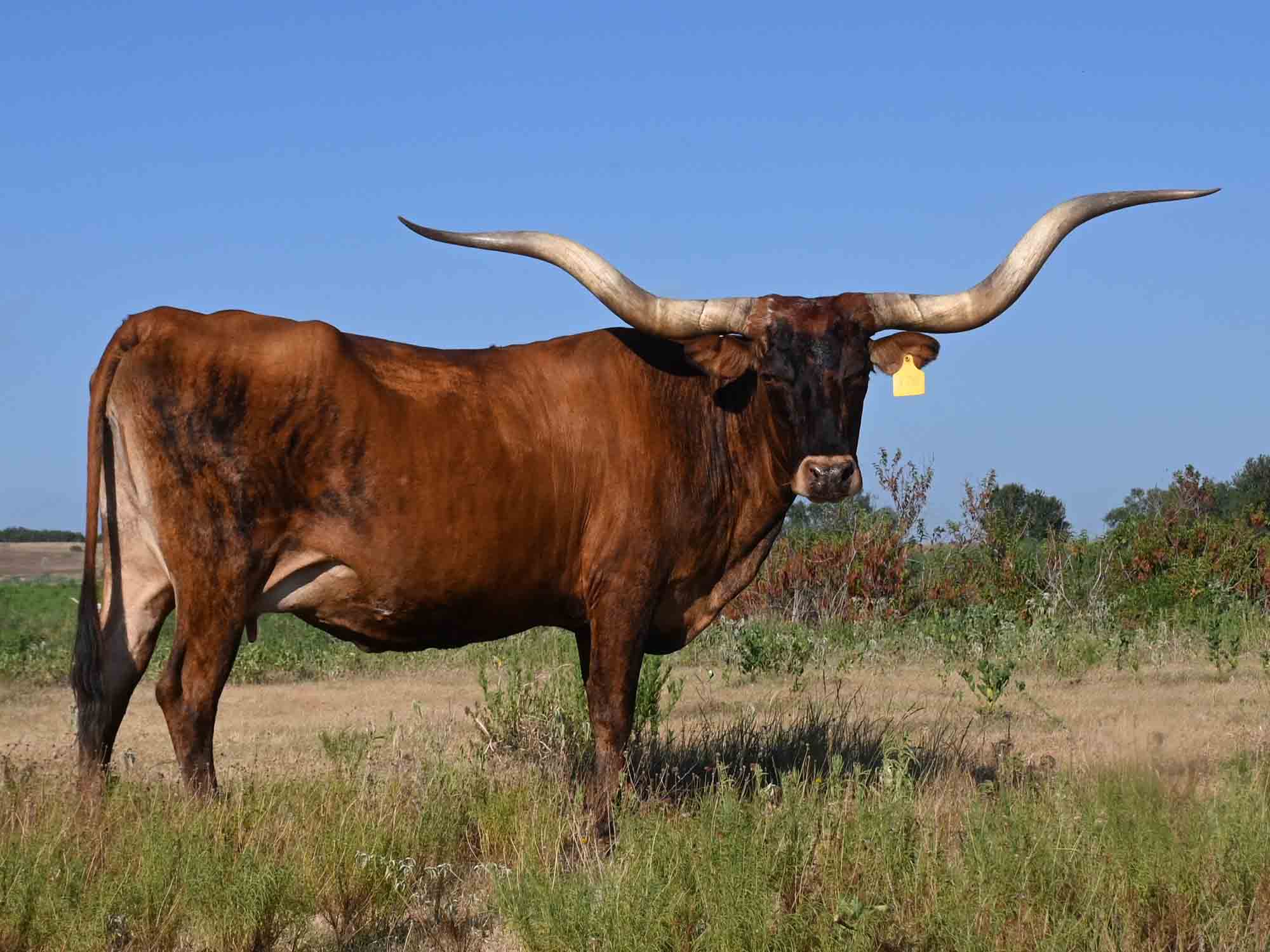 Description of RM Total Lady: Total Lady is one of our purchases from the dispersal of the famous Red McCombs herd. We went to the ranch before the sale and identified a small group of cows that we thought would be great additions to our "pretty and productive" herd. Total Lady stood out for several reasons. First, she is beautiful. She has striking brindle color, feminine features, and twisty horns. Second, she is royally bred. Her late sire is one of the hottest bulls in the breed. Her dam has been an embryo donor with high demand for her offspring. Top Caliber was one of the very best producers in the 2010's. WS Rainbow is one of the most magnificent cows in the history of the breed and is a maternal sister to the legendary WS Jamakizm. Third, she is a producer. Her 2022 heifer was the high selling lot at the heifer sale portion of the Red McCombs dispersal sale, going for $20,000. We are really excited to add this beauty to our herd!