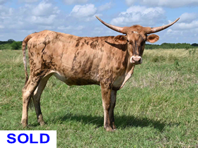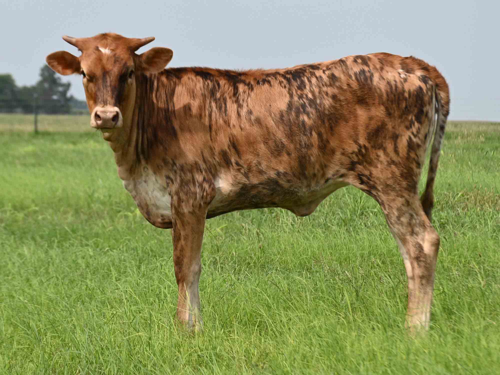 Description of RO Painted Lilly: Painted Lilly's parent are two of the flashiest brindles the longhorn breed has seen. She is pretty flashy herself! We have really liked Painted Lilly but there are two quirks about her that have led us to lower her price. First, she is a more slender heifer than we would have expected based on her genetics. She looks healthy, but she doesn't have the girth of most of our cattle. Second, she likes to stay by herself a lot. There was a time when we were worried she was sick or not feeling well based on her isolation and thinner body type. It is still possible that something is bothering her, but it has been a long time since she has acted this way, and she is still growing well. She seems fine socially when we call the cattle up. She just is fine staying by herself out in the pasture. She isn't always by herself, but she will stay where the cattle were grazing after the others have moved on. Of course we all know people who go against the grain, so she could just have that personality. Either way, we have lowered her price in case there is something bothering her. Let us know if you would like more info (such as a video) on how she acts and looks.