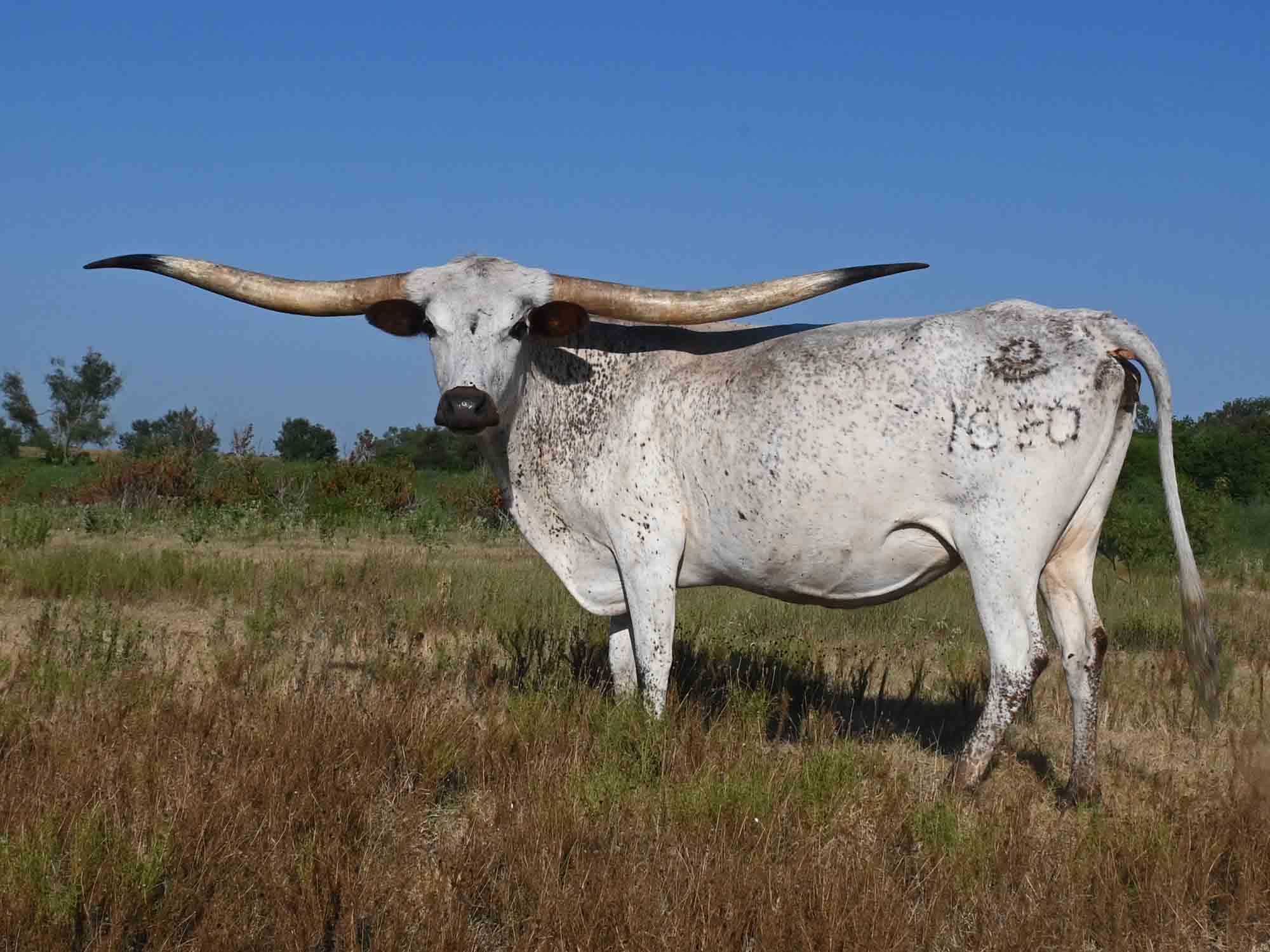 Description of RO White Party: White Party's sire is one of the longest horned bulls in the breed, and her dam has produced three of the prettiest heifers we have ever raised. She has grown into a wonderful cow with elite horns!